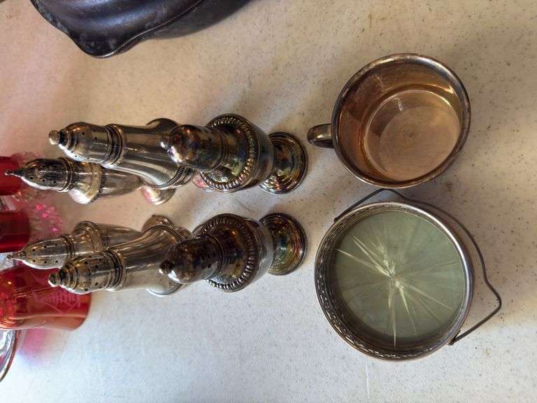 LOT 33 - (6) Sterling salt and peppers, cup, coasters