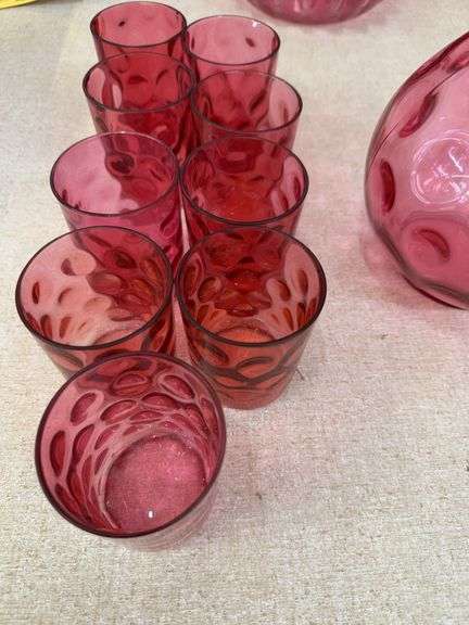 LOT 44 - Cranberry pitcher and 8 glasses